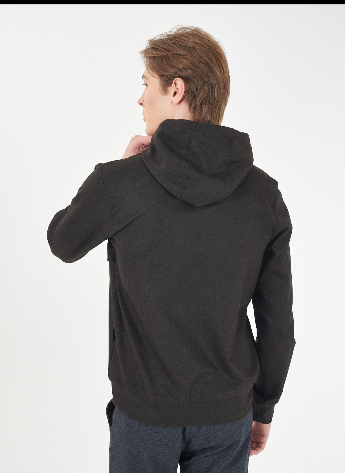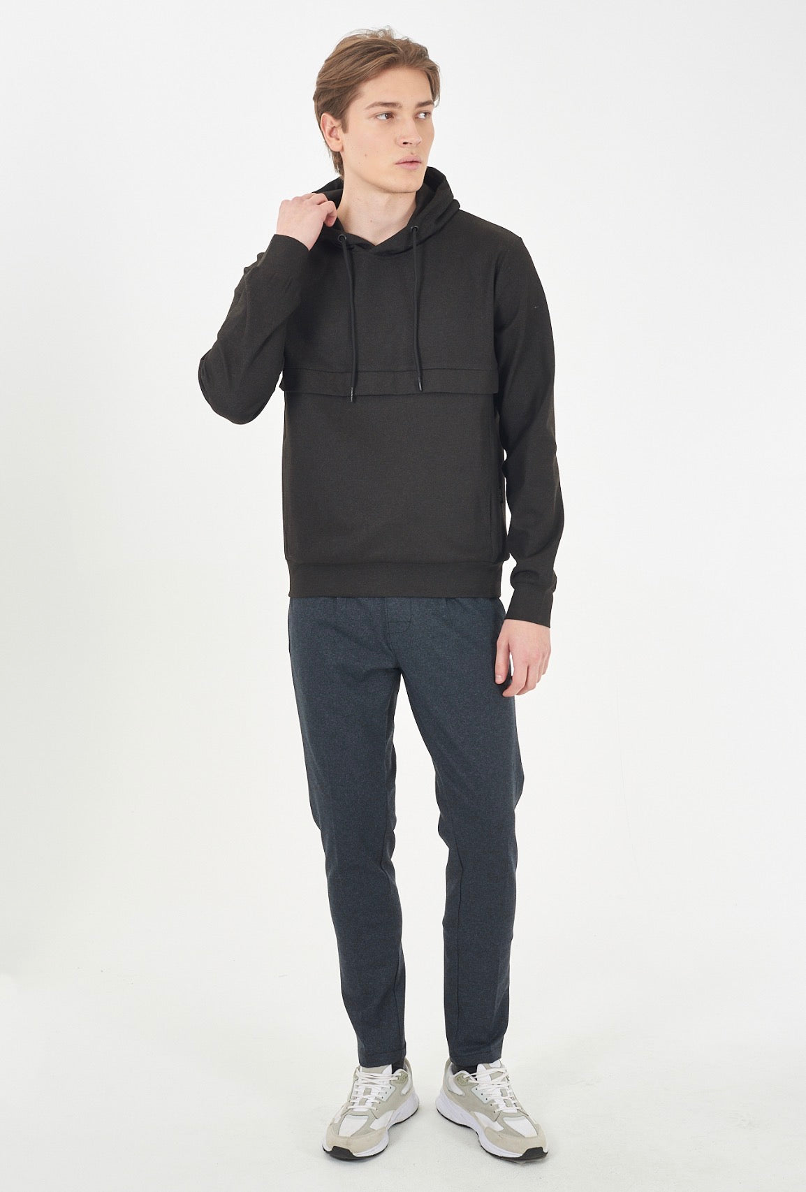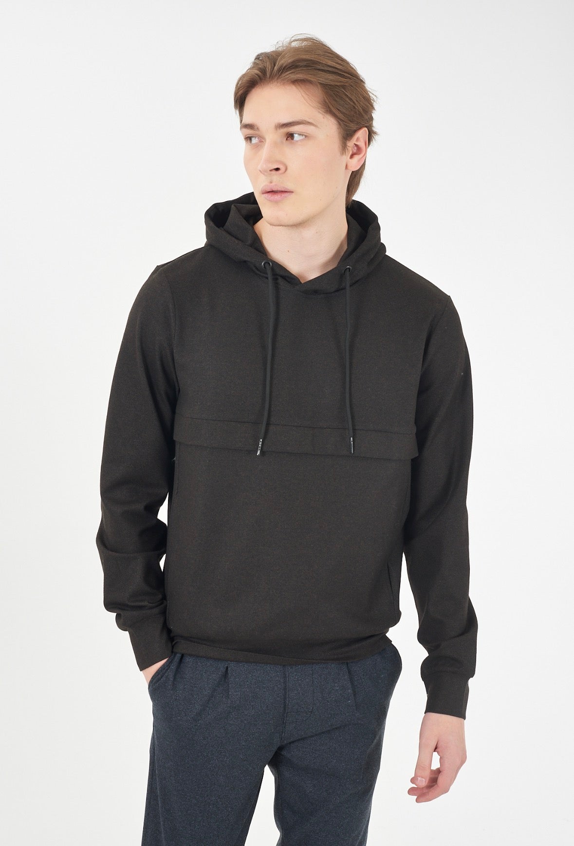Felpa uomo chiusa con cappuccio, tascone sul davanti, tessuto tecnico , soft touch.