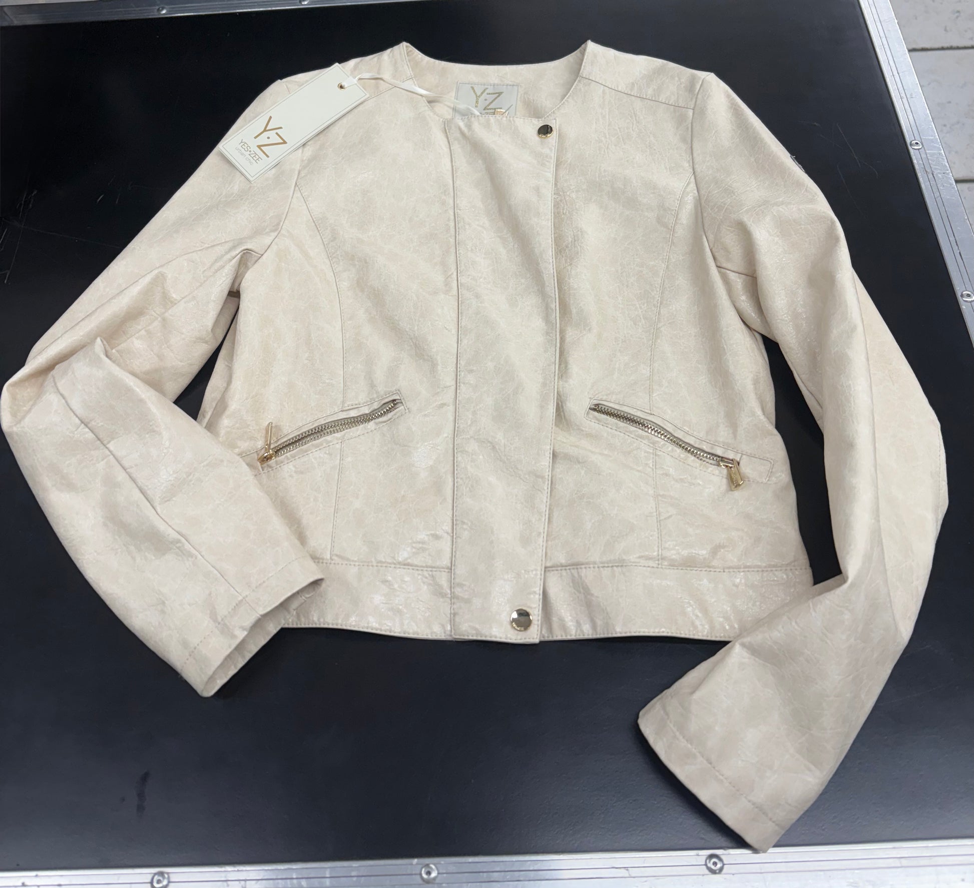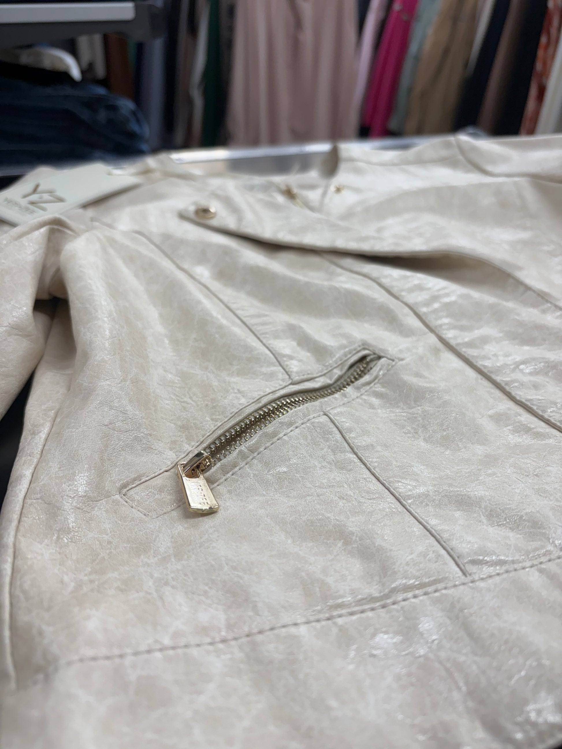 Giacca eco pelle donna taglio corto. Collo a girocollo. Zip intera. Taschine tessuto effetto spalmato.
