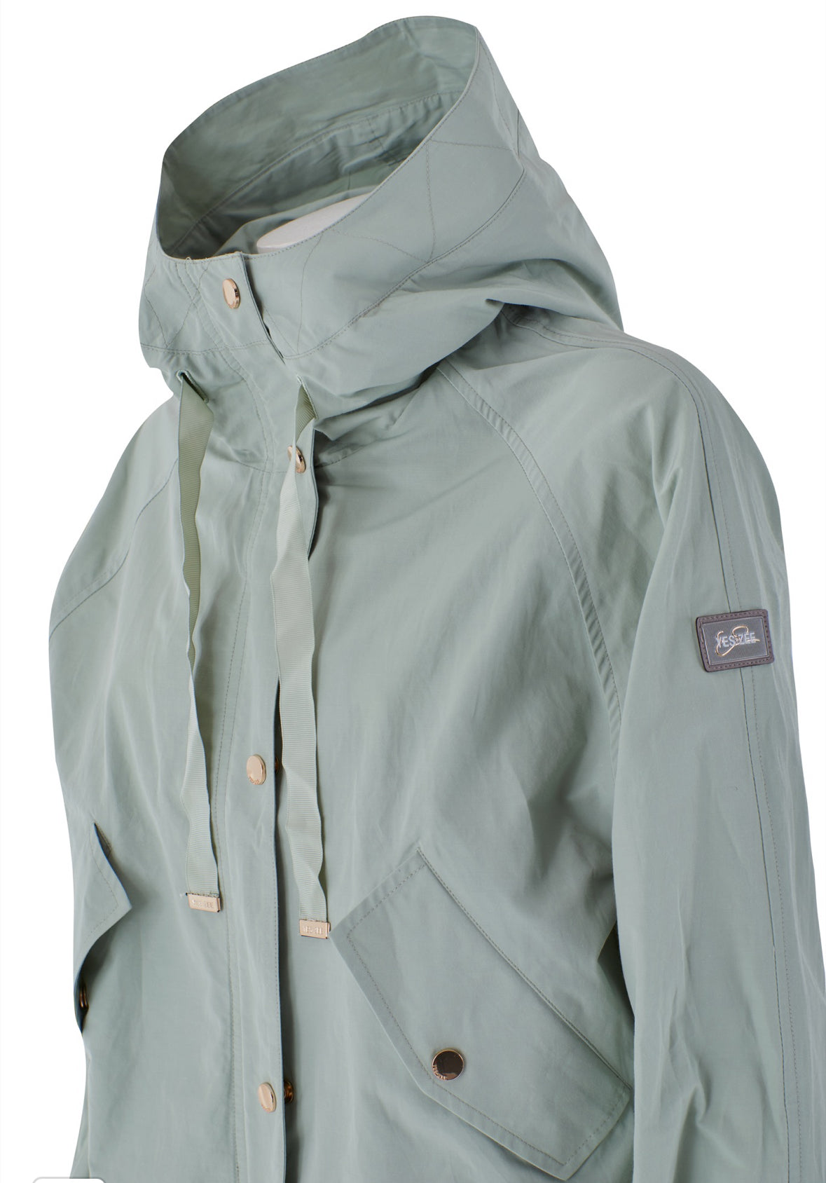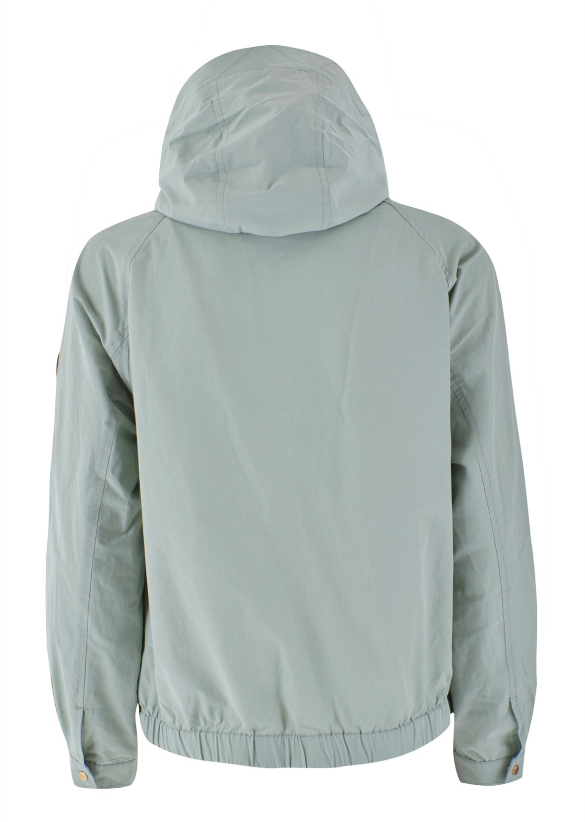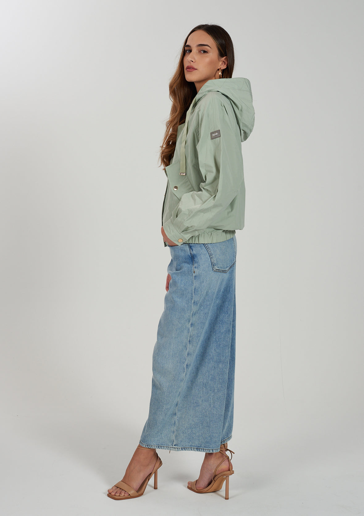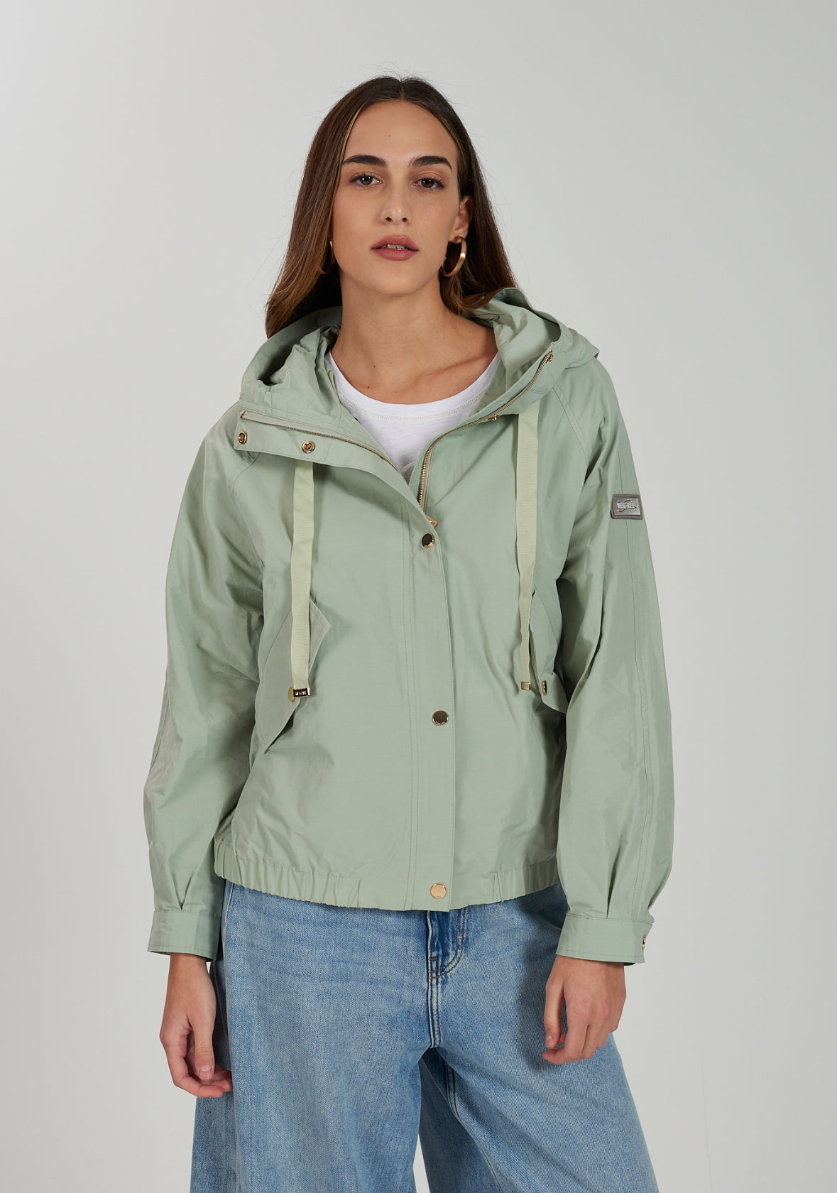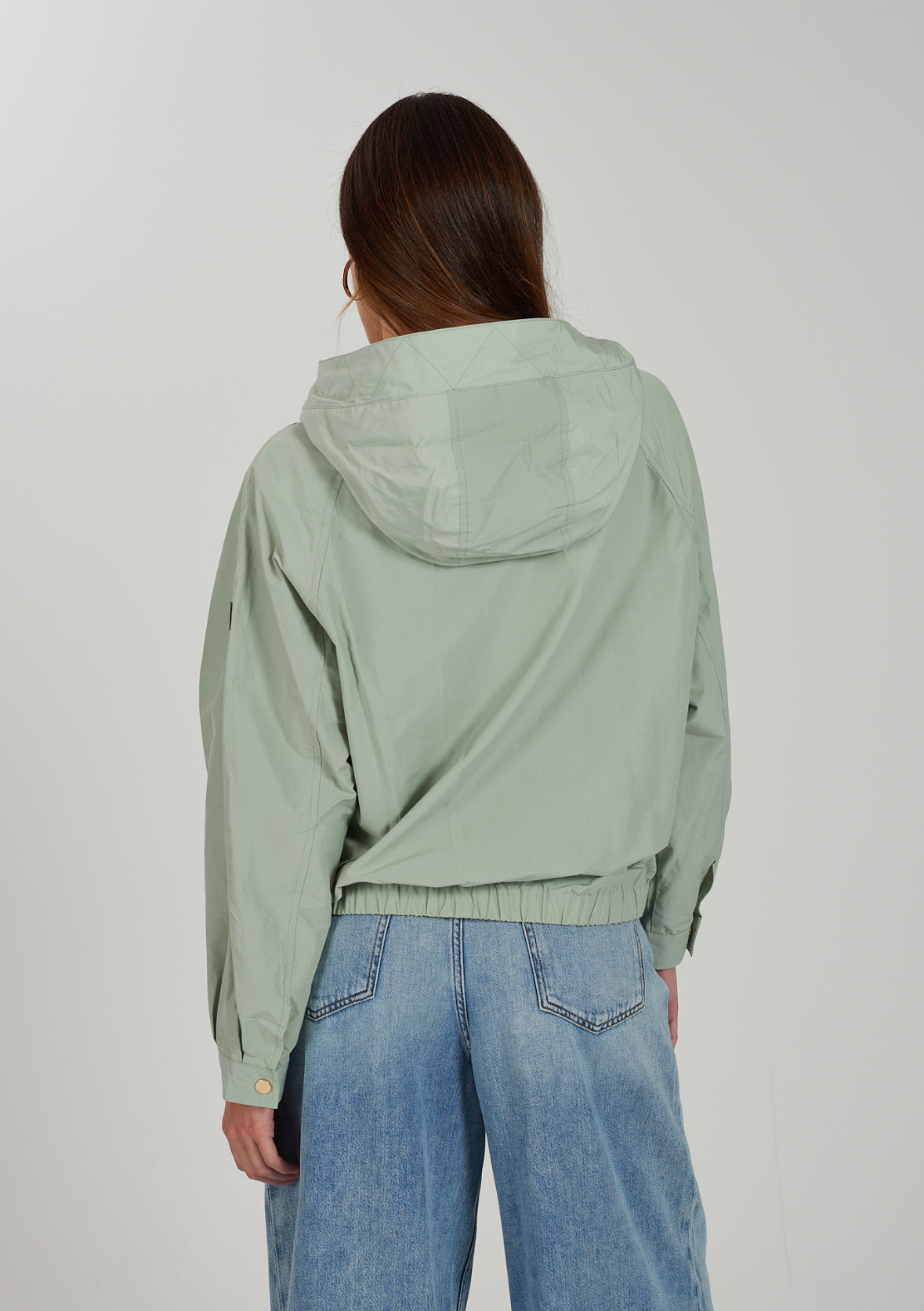 Giubbino donna corto con cappuccio, elastico in vita tipo bomber. Zip intera, tasche laterali comode. Polsino con bottone vestibilitá morbida.