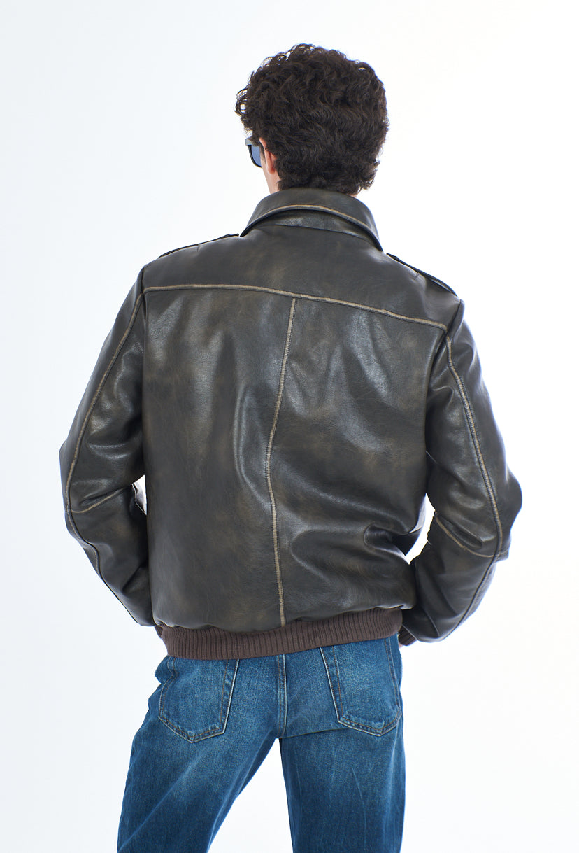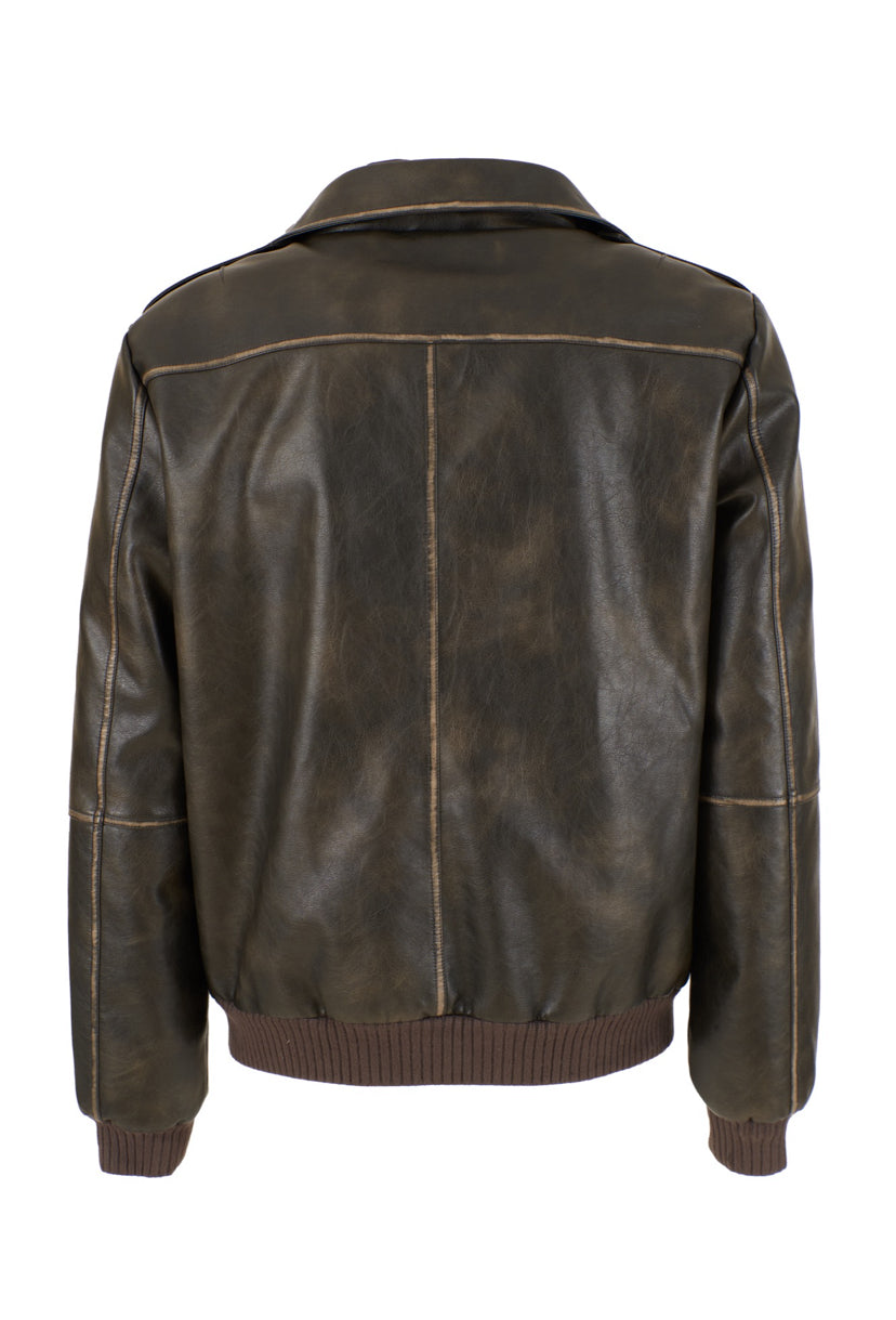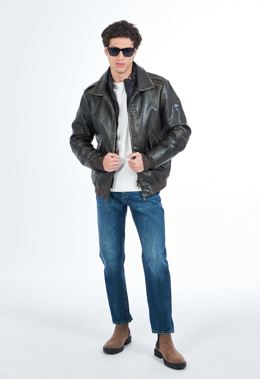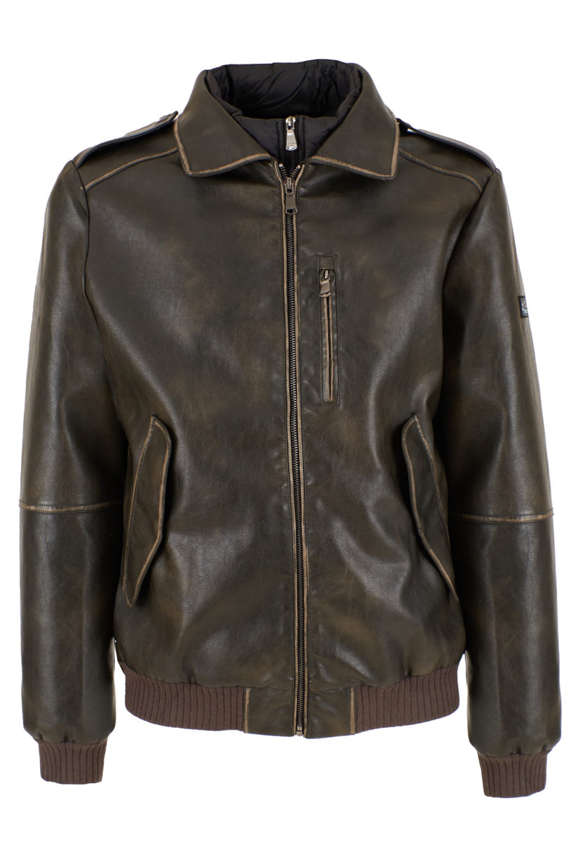 Giubbino uomo bomber, con polsino e fascia in maglia. in ecopelle spalmata,interno trapuntato. Colletto rimovibile con finto gilet.