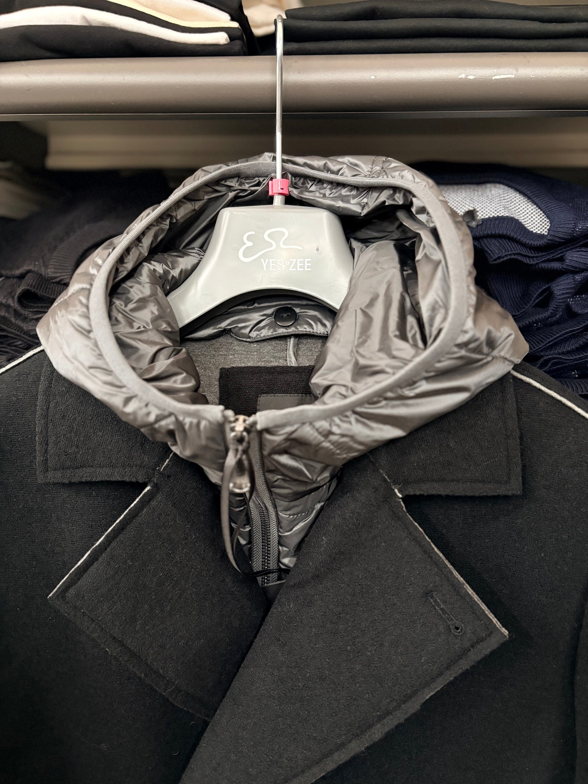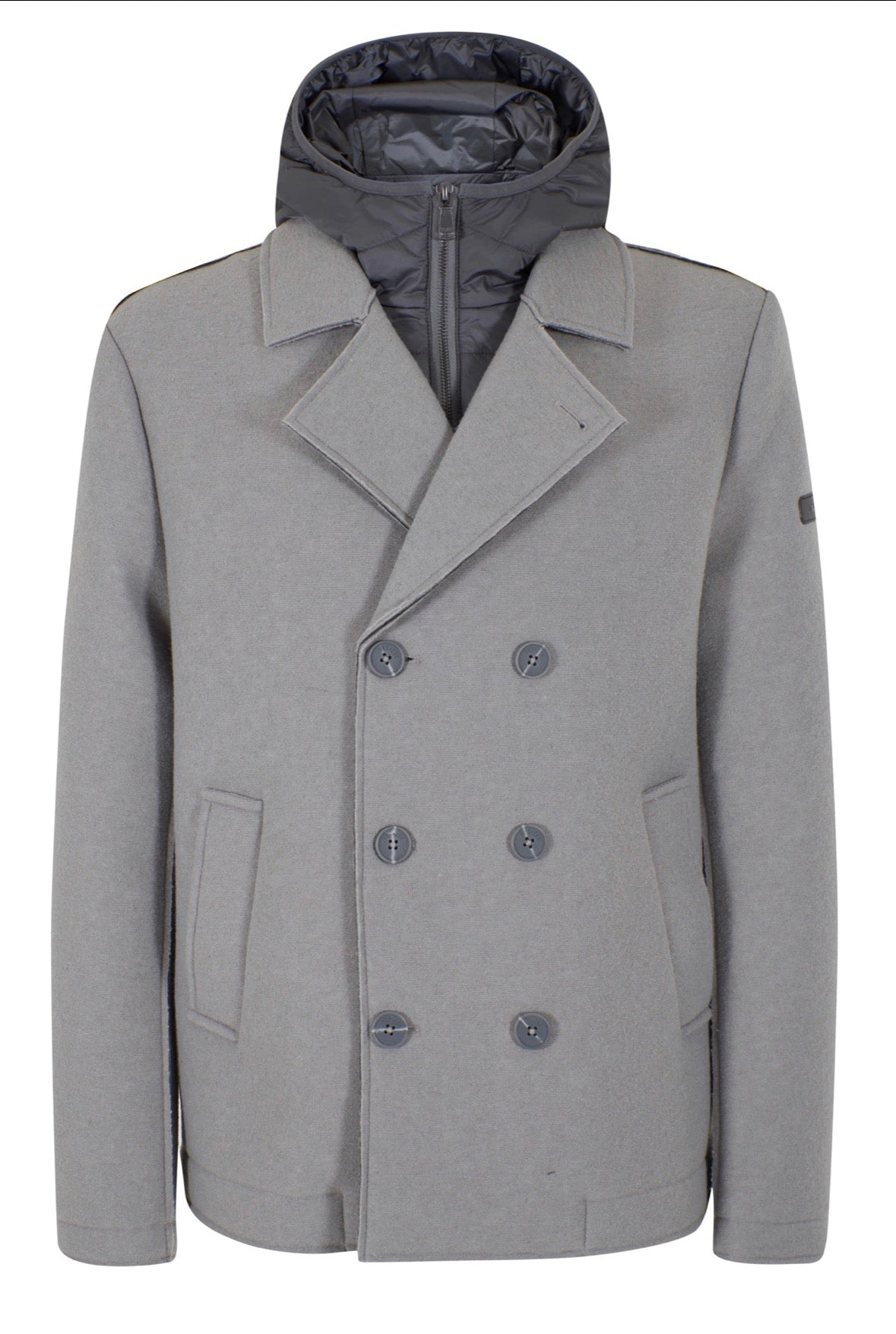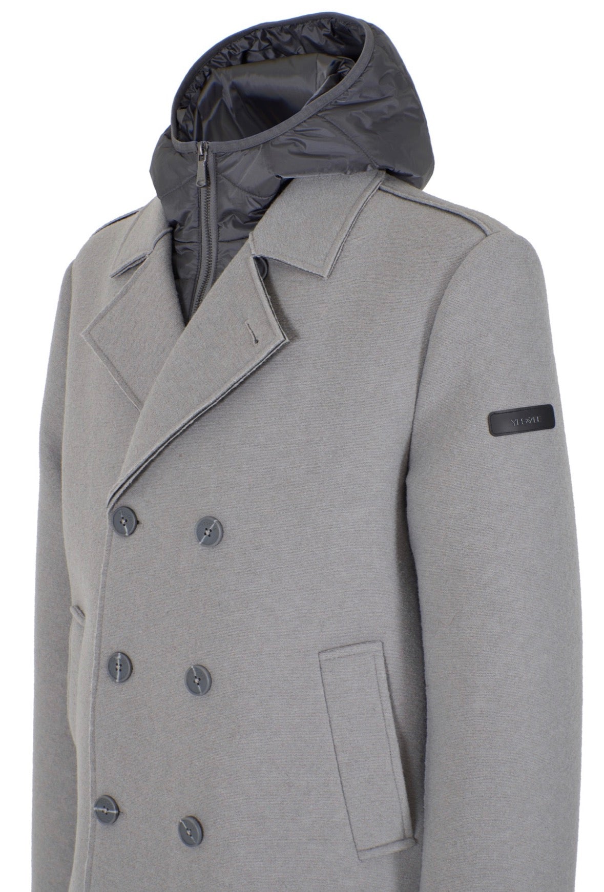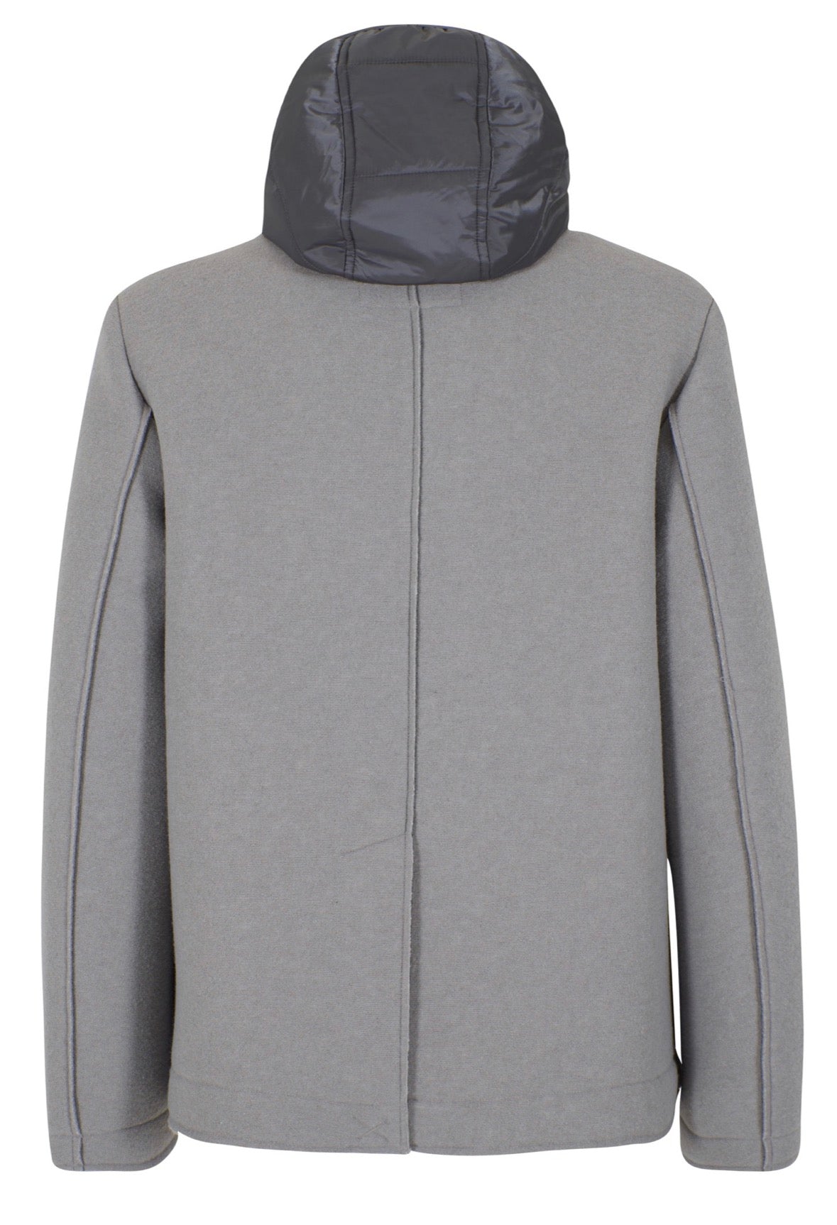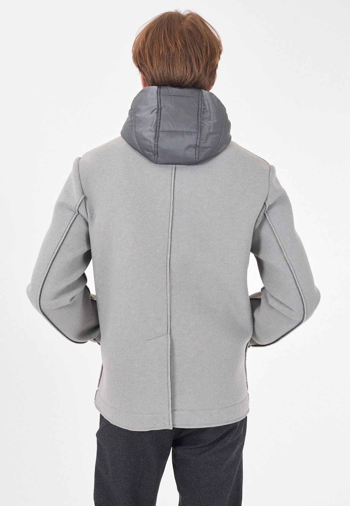 Giubbino uomo doppiopetto, sfoderato, con finto gilet con cappuccio rimovibile.