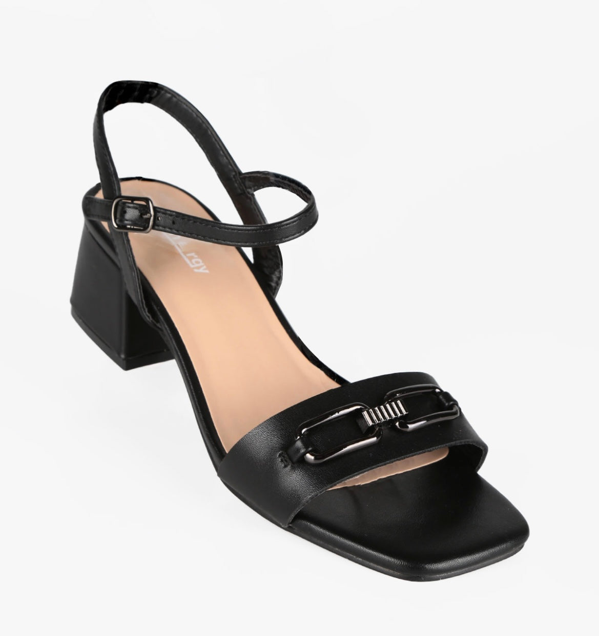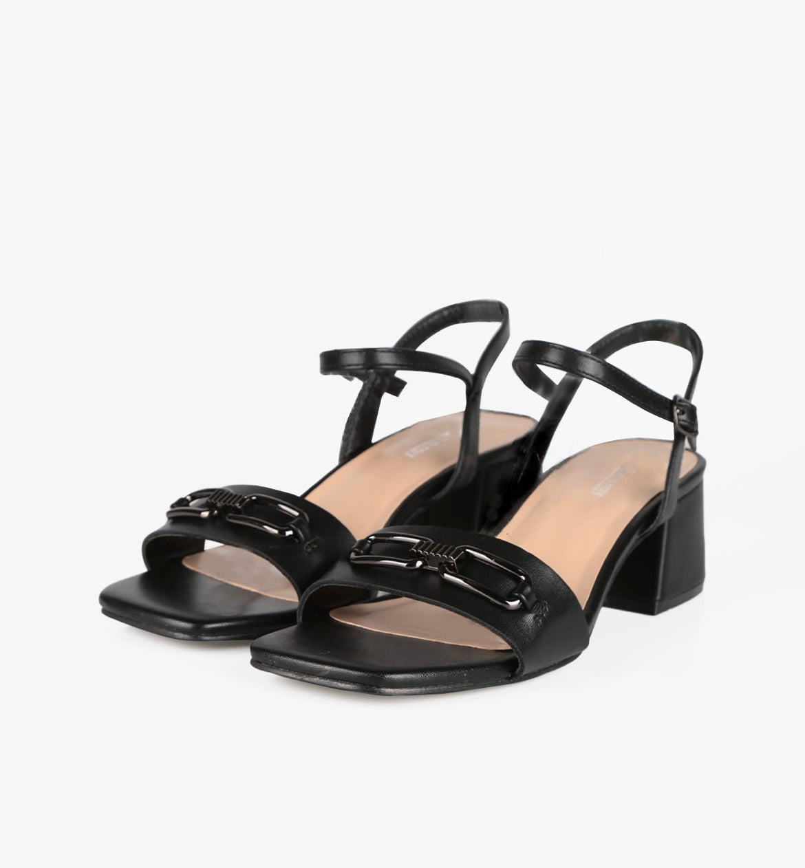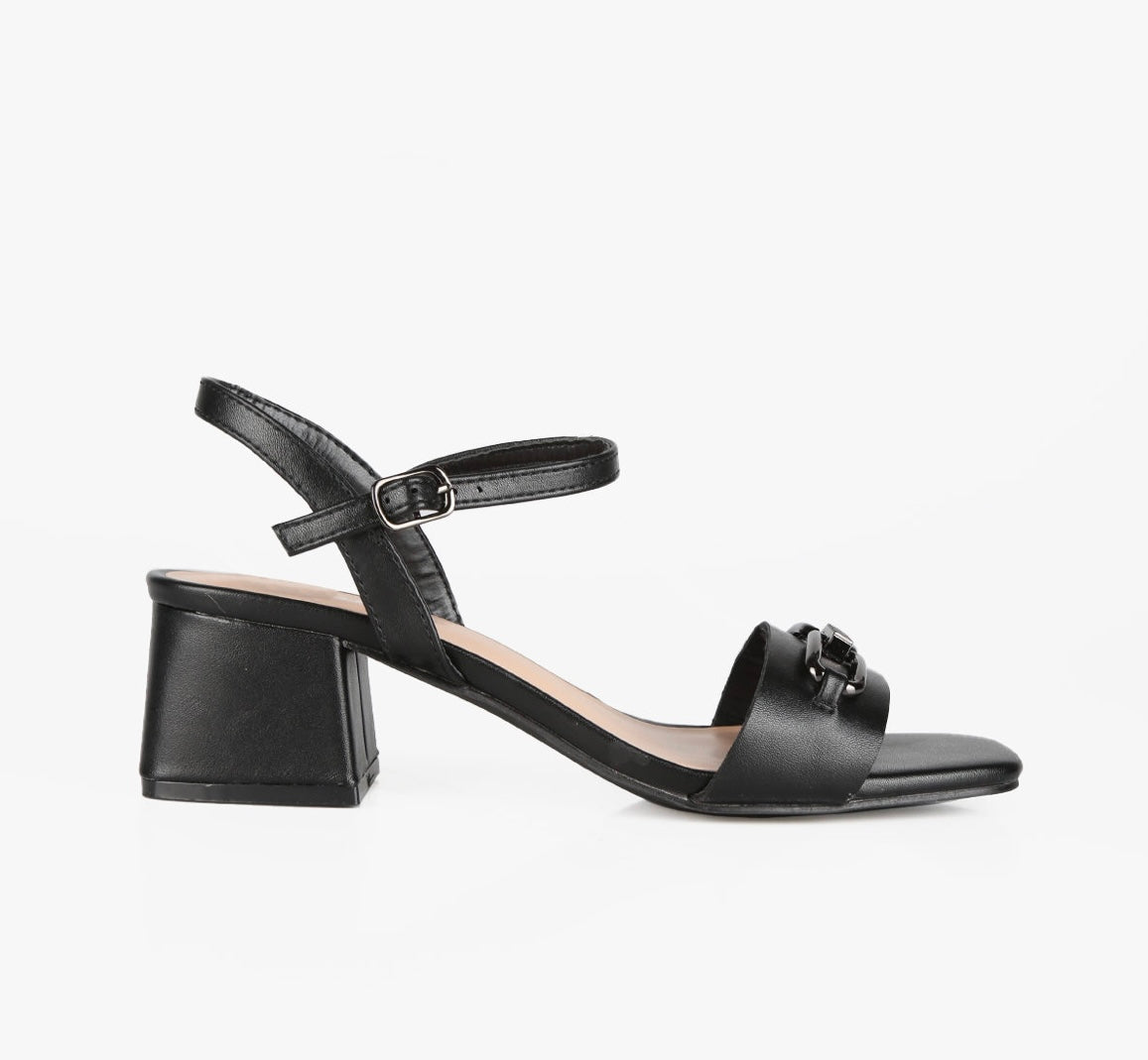 Sandali donna, tomaia in ecopelle, fascetta sul davanti con fibbia decorativa, cinturino alla caviglia, plantare in morbida ecopelle, tacco alto 5 cm, suola in gomma antiscivolo.