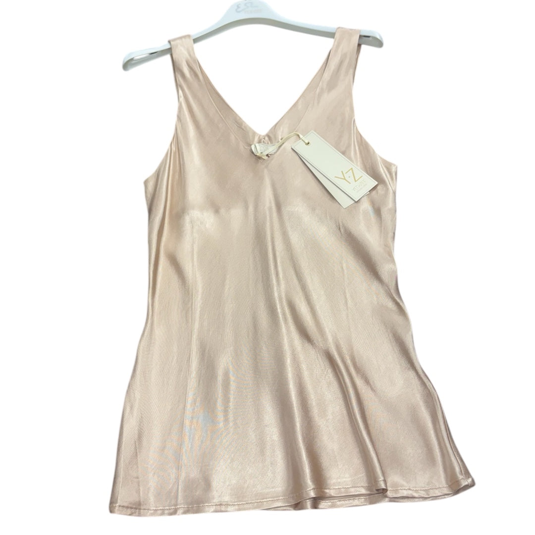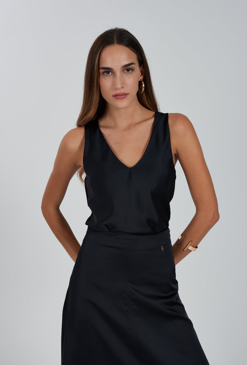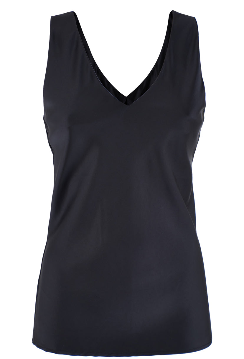 Top donna scollo a V davanti e dietro. Spalla larga in raso di viscosa, fluida e morbida sulla pelle. Effetto lucido.
